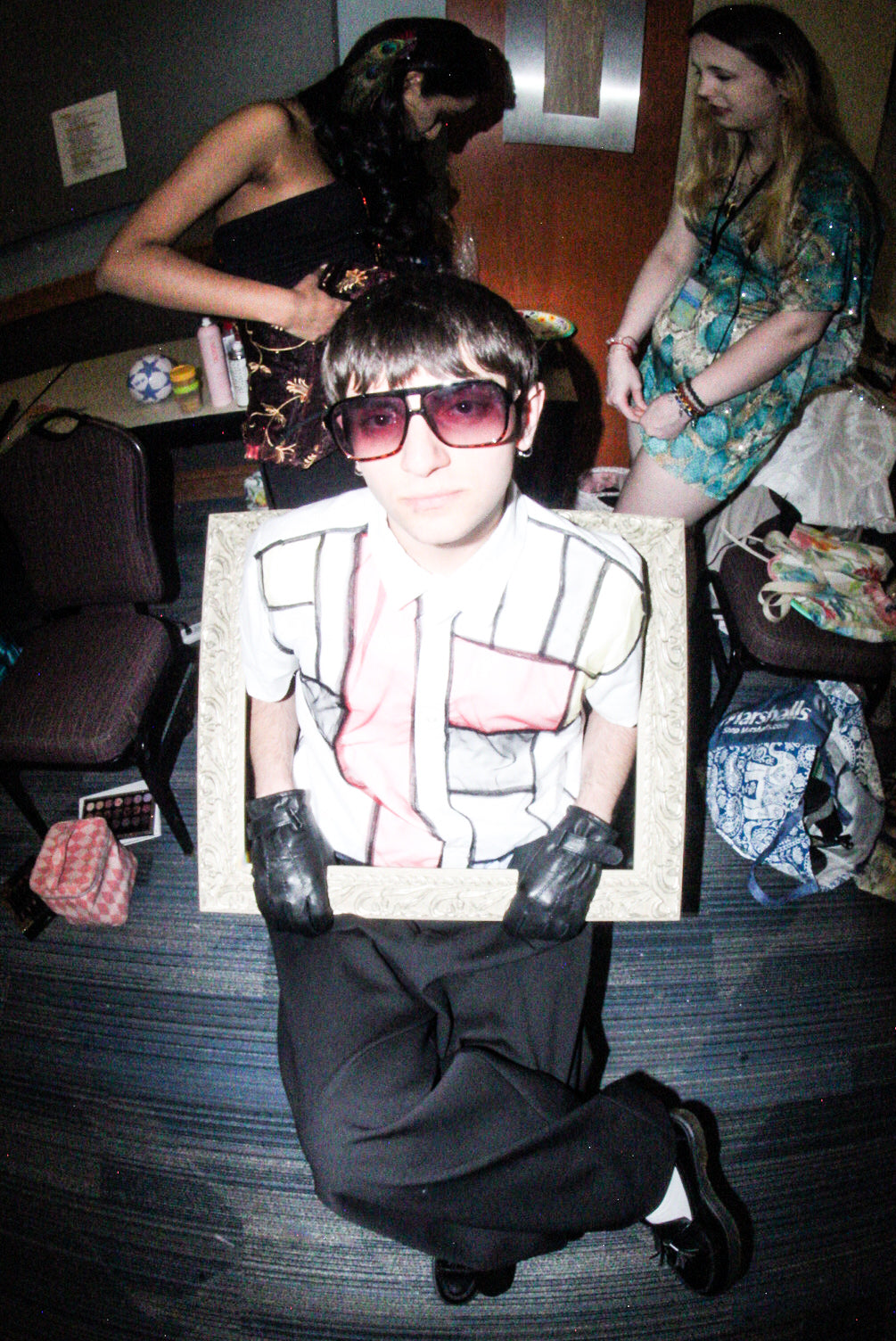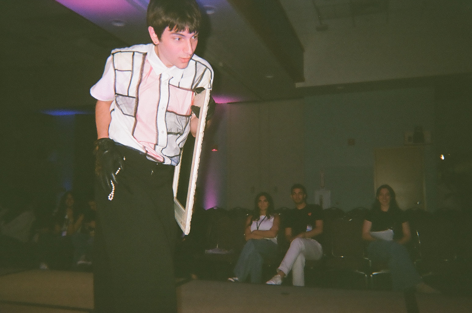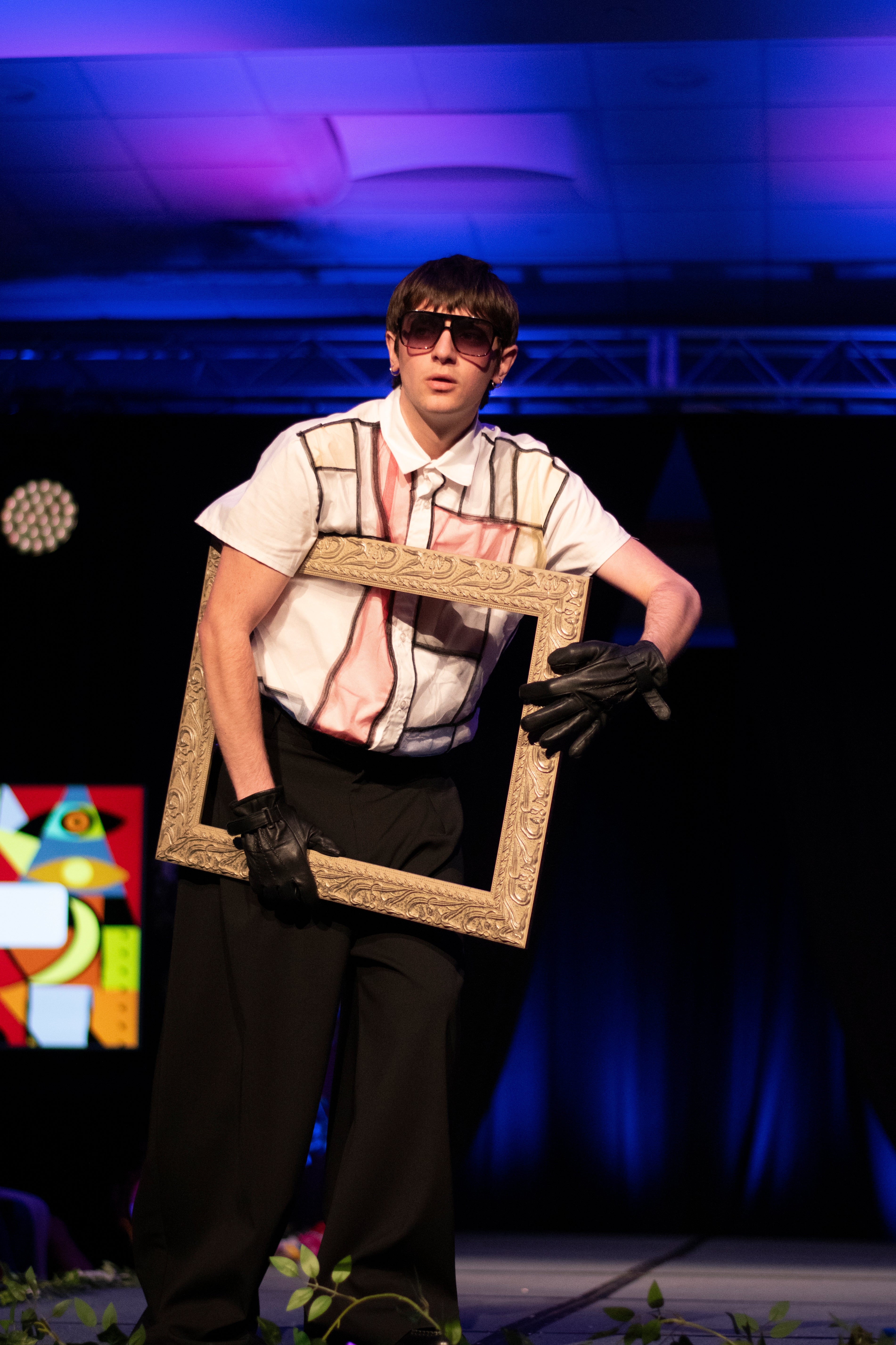 Shown at the Brookdale Eras of Art Spring 2025 fashion show, the Compositions button-up is made from 100% cotton poplin with a mesh overlay on each side of the garment, creating a visual resemblance to Piet Mondrian’s Composition with Red, Blue, and Yellow. Each side features a different interpretation of the painting.